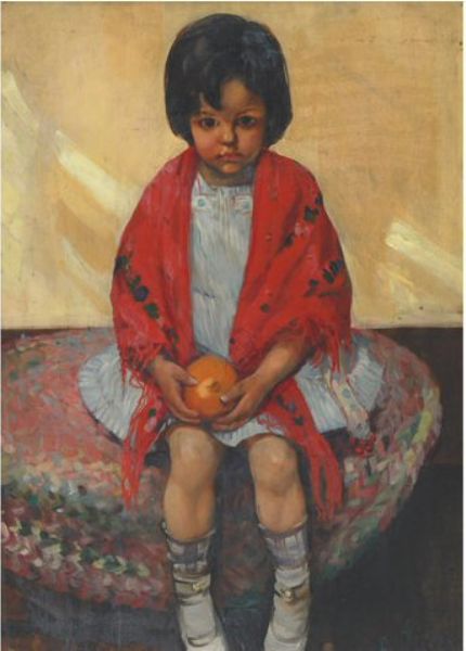 GIRL WITH RED SHAWL HOLDING AN ORANGE