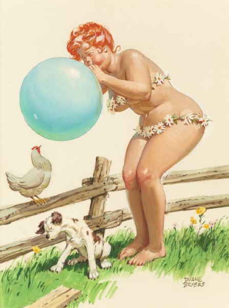 Hilda Blowing Up a Balloon, Brown & Bigelow calendar illustration