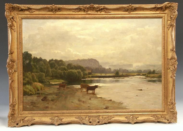 | Highland cattle watering at the riverside in a Northern landscape | |