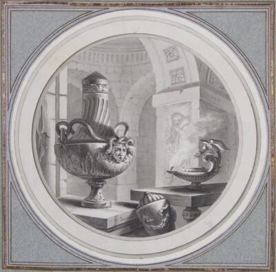 | Perfume burner in an architectural setting. A sarcophagus and an obelisk in a temple. | |