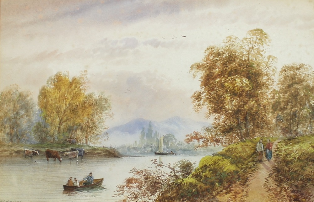 | a watercolour study of an autumnal lakeside landscape with cattle in the river and rowing boats | |