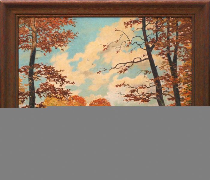 Herbstlicher Laubwald, im Vordergrund zwei äsende Rehe auf einer Lichtung