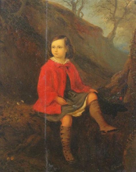 Child wearing a red cape seated in a landscape