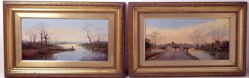 a pair of pastoral riverside landscapes, one with cattle crossing a bridge