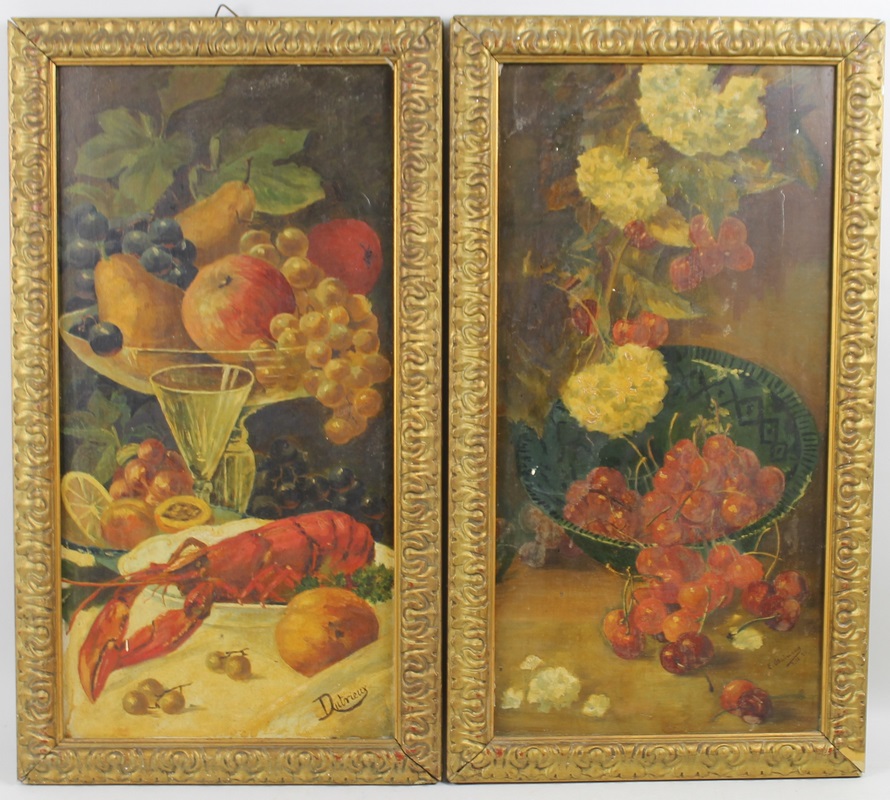 | a pair of still life studies, one with lobster and fruit bowl, the other cherries and carnations | |
