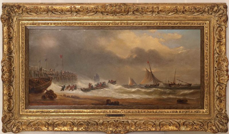 Blick über eine Bucht bei stürmischer See unter gewittrigem Himmel.
