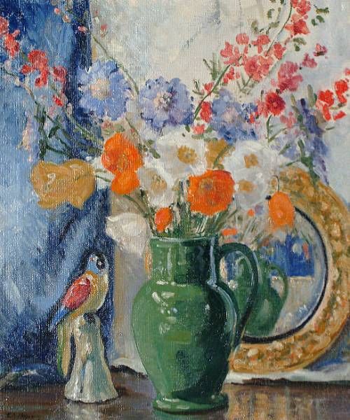 Still Life with Bouquet in green Jug, Mirror and Porcelain Parrot