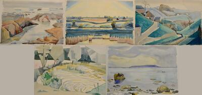 Signed and inscribed, recto and verso, pencil and watercolour, unframed together with four further watercolour landscape studies including "N. Devon Coast", "Dutch Landscape", "Bonsall Derbyshire" and another, 35.5cm by 50.5cm (all unframed) (5) | |