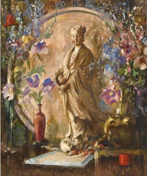 Still life with flowers and Oriental statue