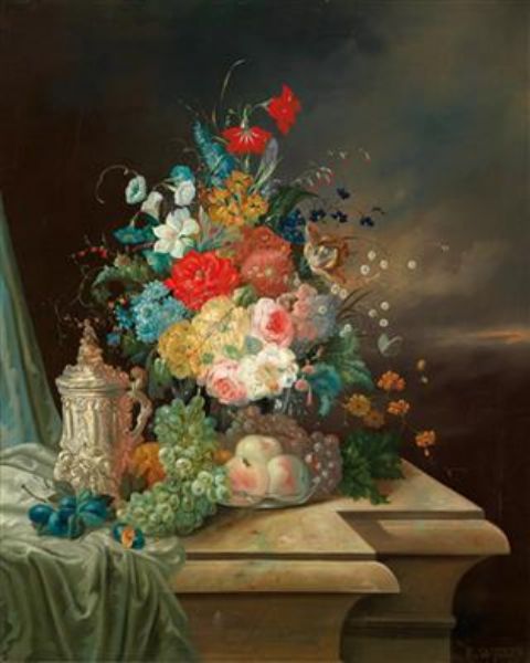 Großes Blumenstück mit Obst und einem Silberhumpen