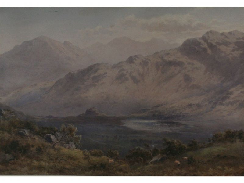 | A LAKELAND SCENE, sheep grazing with small tarn and mountains in background | |