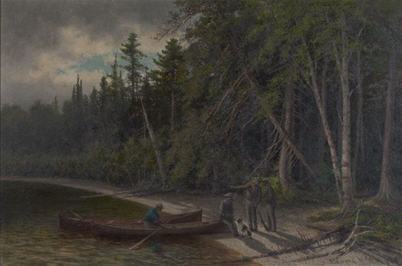 Fishermen at a wooded shoreline