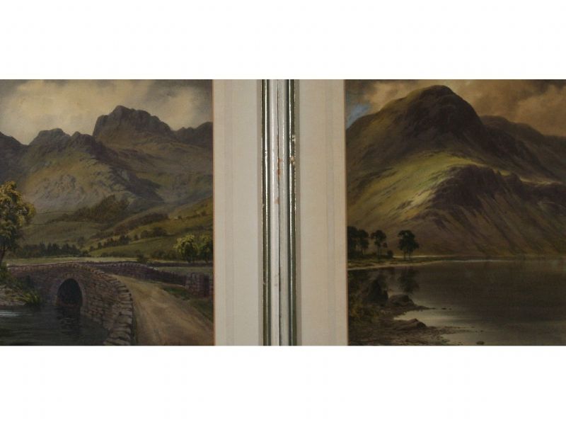 | a stone bridge with fells beyond, signed lower right, in modern frame and card mounted under glass | |