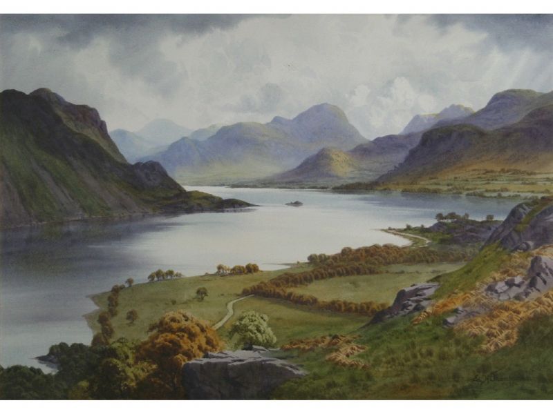 | AUTUMN' ULLSWATER from GOWBARROW PARK WITH ST. SUNDAY CRAG, a view from an elevated position, looking down to a calm lake and au | |