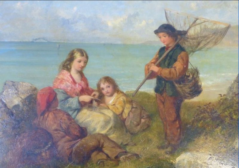 | children seated among rocks on seashore holding fishing nets, with boats in background | |