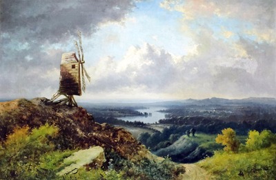| Extensive river landscape with post mill to foreground bank | |