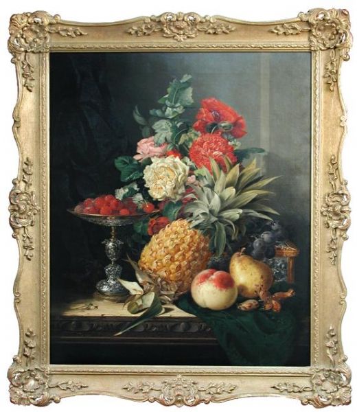 | Still life with a pineapple, roses, carnations, cob nuts, peaches, a pear, black grapes, raspberries on a parcel gilt tazza, wit | |
