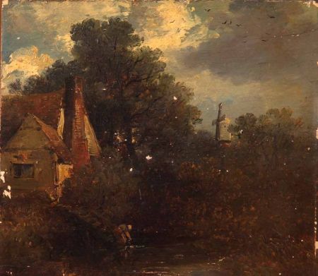| East Anglian Landscape with Lady Washing by a Cottage, Windmill to Distance | |
