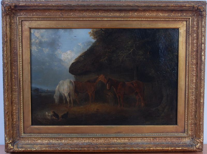 Horses and chickens before a barn