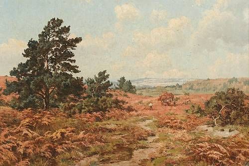 Heathland landscape with men cutting bracken and horse and cart