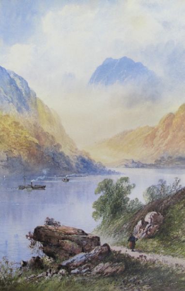 LOCH LOMOND WITH STEAMERS AND FIGURE ON A TRACK