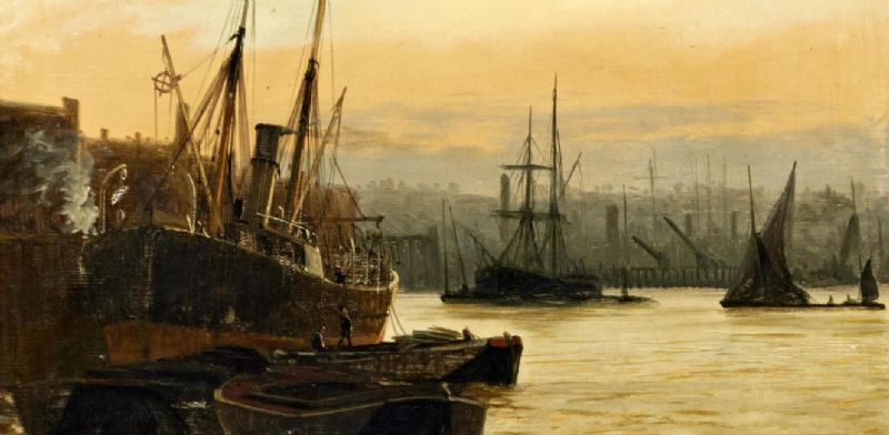 | Coal barges by a coastal steamer at a wharf; Haybarge and steamer moored in an estuary, possibly the Thames or Medway, a pair | |