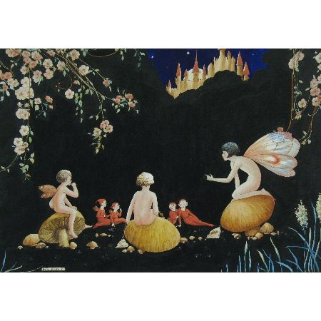 | fairies and goblins etc engaged in various playful pursuits amongst blossoming or fruiting branches, poppies etc on a black grou | |