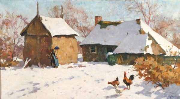| Winters sneeuwlandschap met boerenhofje enenkele kippen op de voorgrond | |