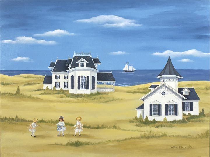 Victorian Summer depicting children playing by two houses and the sea.