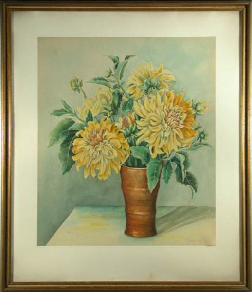 Prächtiger Dahlienstrauß in einer Tonvase vor changierendem Hintergrund