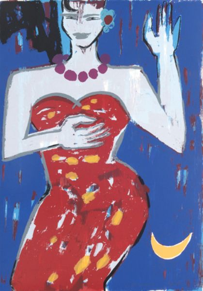 Frau in rotem Kleid und Mondsichel