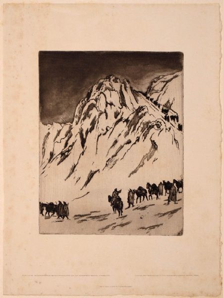 Soldaten mit Maultieren im verschneiten Gebirge.