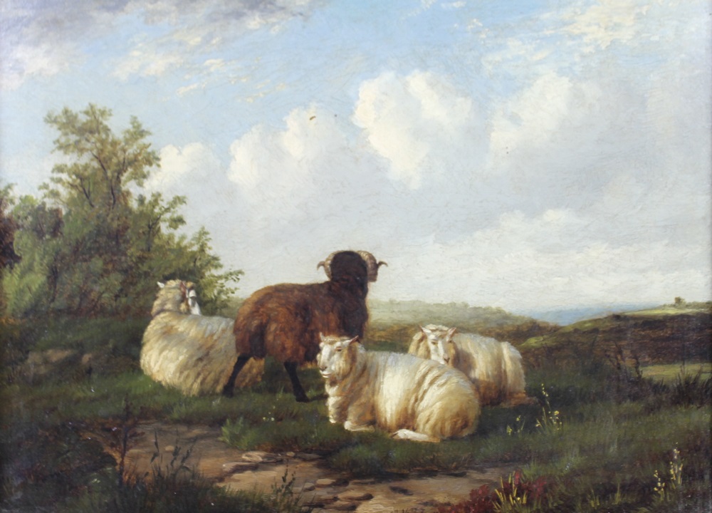 | three sheep and a black ram, in a landscape | |