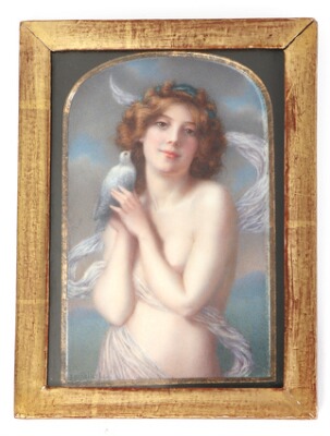 | Miniature portrait of a lightly dressed woman holding a pigeon | |