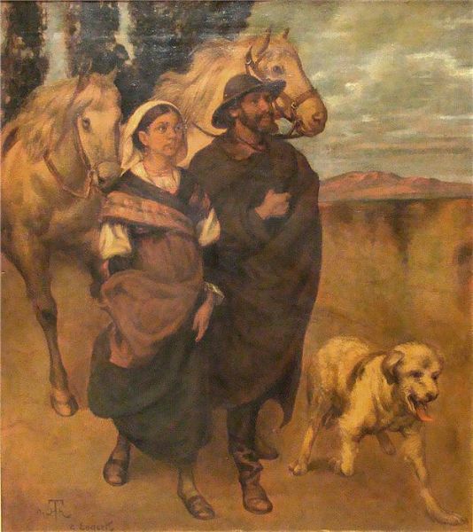 Südländisches Paar mit Pferden und Hund, nach Hans Thoma.