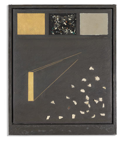 Unknown bone, blood, meteorite dust, radio parts, gold leaf and lead on panel