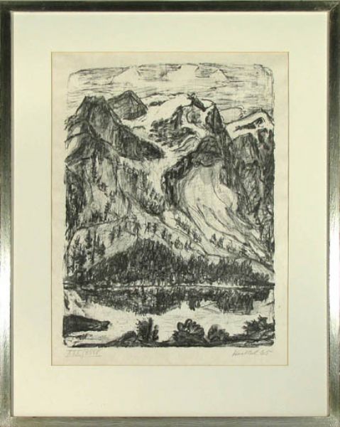 | Von Bäumen umgebener Gebirgssee, im Hintergrund die schneebedeckten Berggipfel | |