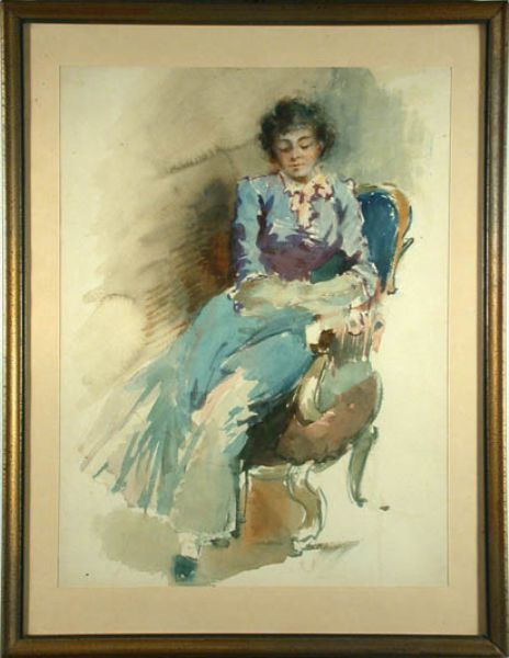 Junge Dame in einem langen Kleid, auf einem barocken Sessel ruhend