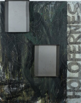 Oil steel wire and metal trays on canvas