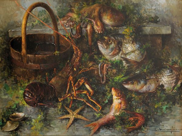 | Natura morta di pesci, crostacei e recipiente di legno | |