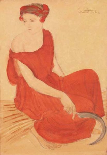 Junge, sitzende Frau in rotem Kleid mit kleiner Sense in der Hand