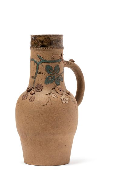 | Pichet à anse en grés partiellement émaillé à décor de motifs floraux en creux et en léger relief. | |