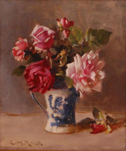 Still life roses in a blue and white jug