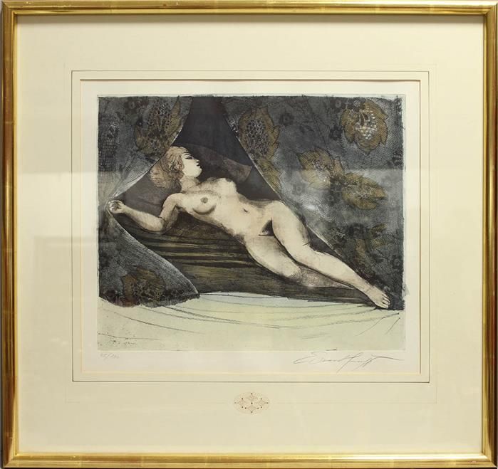 Schlafender, weiblicher Akt, hinter Vorhang liegend