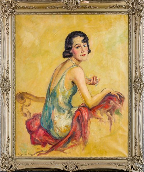 Gesellschaftsdame mit langer Perlenkette spielend, Rückansicht mit zum Betrachter gewendetem Kopf