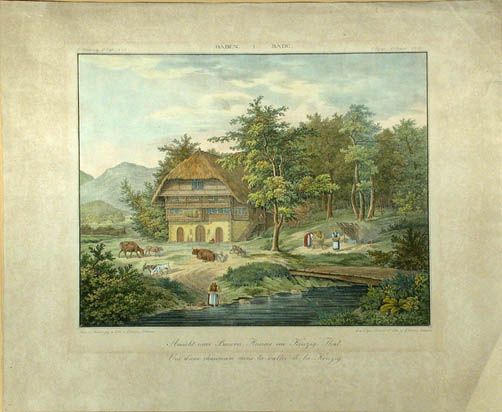 | Sommerliche Partie im Kinzigtal, im Vordergrund einige Frauen beim Wäschewaschen neben einem rauchenden Feuer. | |