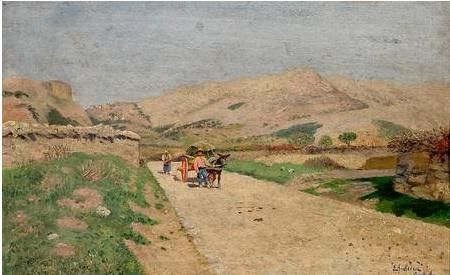 'Dalmatinische Landstraße'. Südliche Landschaft mit Eselskarren und Personenstaffage