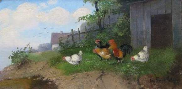 Am Fluss gelegenes Gehöft mit freilaufenden Hühnern und Hahn.