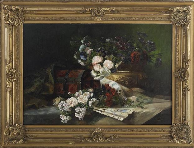 | Still Life of Flowers, Jewelry Casket and a Fan, on a Draped Table | |