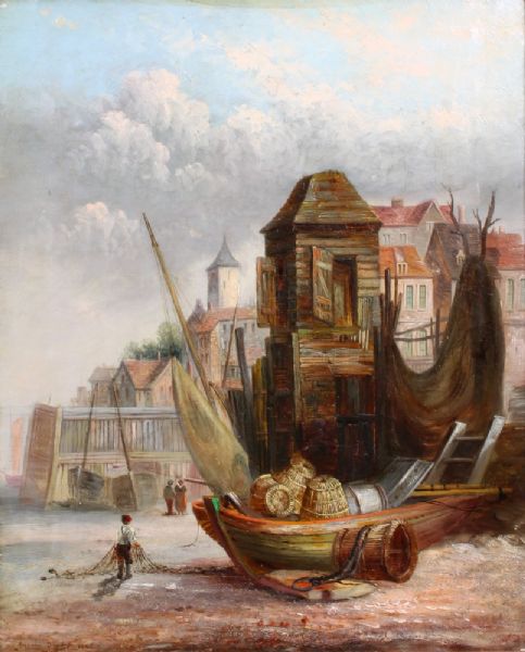 a Continental townscape with moored fishing boats and figures